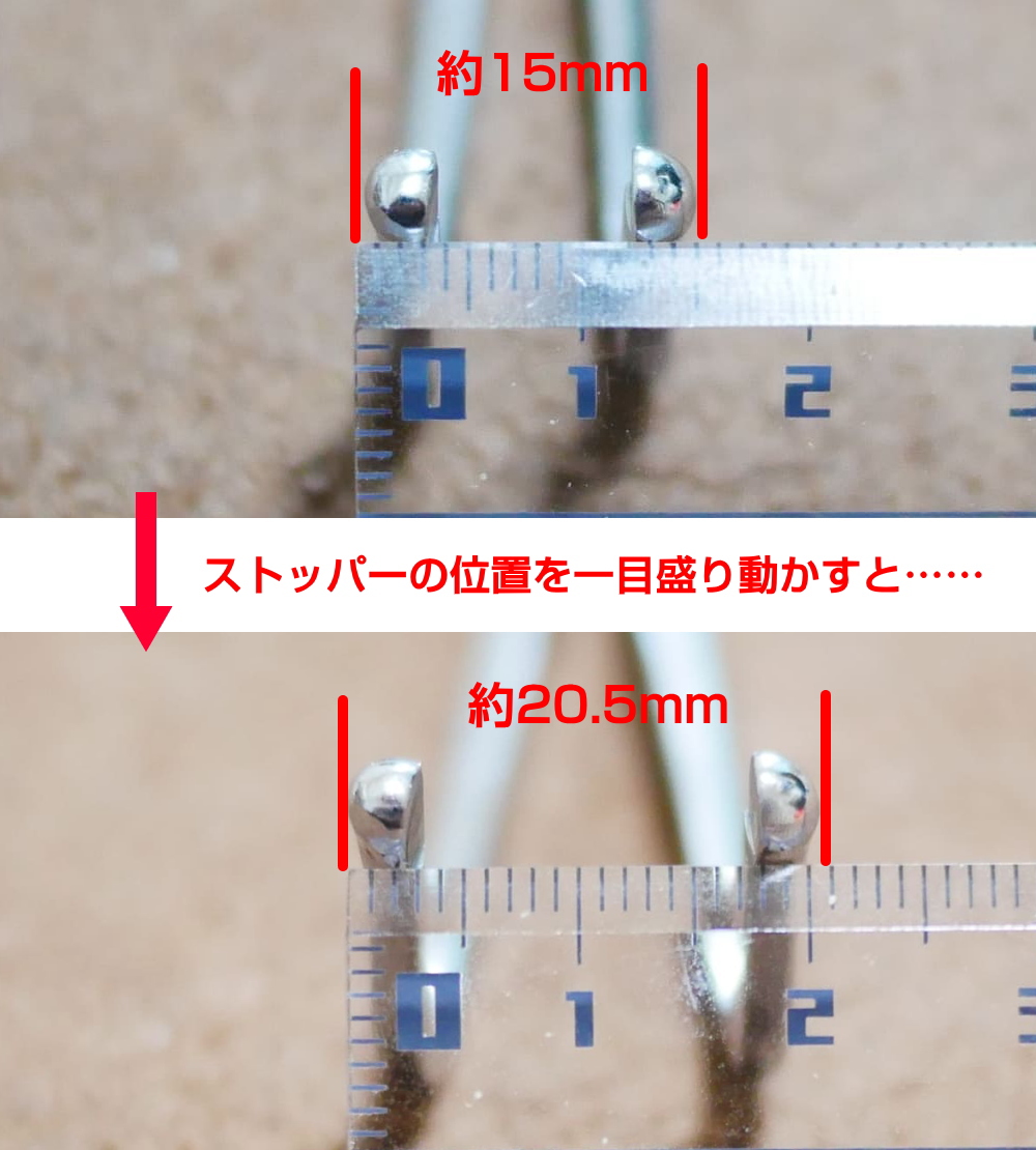 ストッパーに引っ掛ける位置によって、先端の幅が変わります。