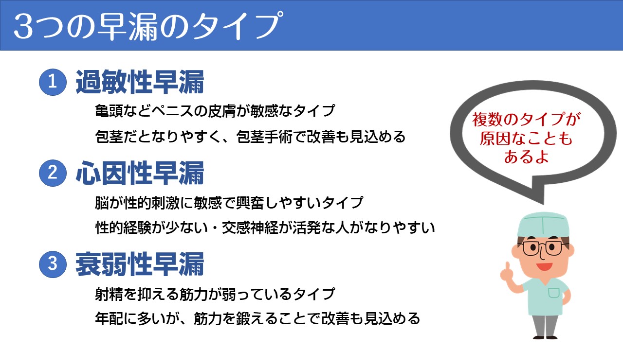 「衰弱性早漏」と「心因性早漏」の2つが原因だったり、3つともすべて原因だったり、複合的になっていることもあります。